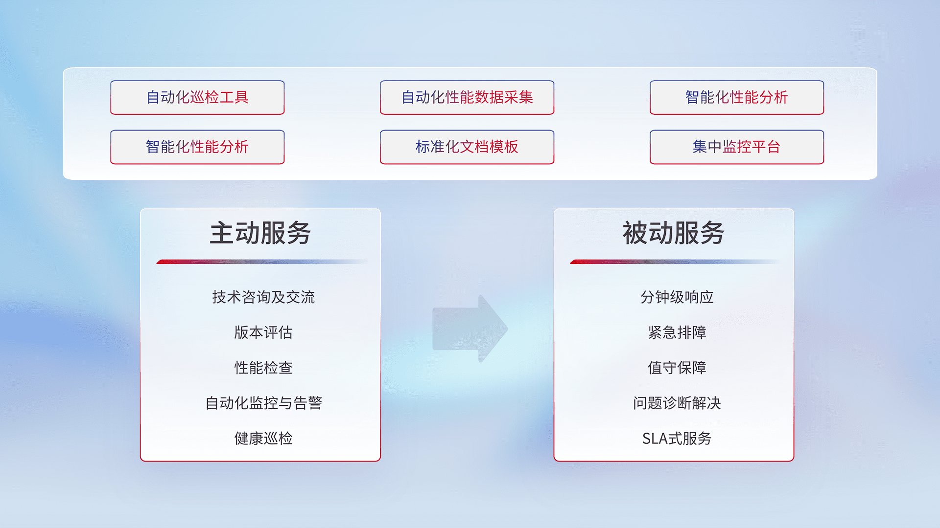 智能化工具和标准化文档,,保障服务质量,,提供主动服务(包含技术咨询、、、版本评估、、、、性能检查、、、、自动化监控与告警、、、、健康巡检)和被动服务包含(分钟级响应、、、、紧急排障、、值守保障、、问题诊断解决、、、、SLA服务)。。。