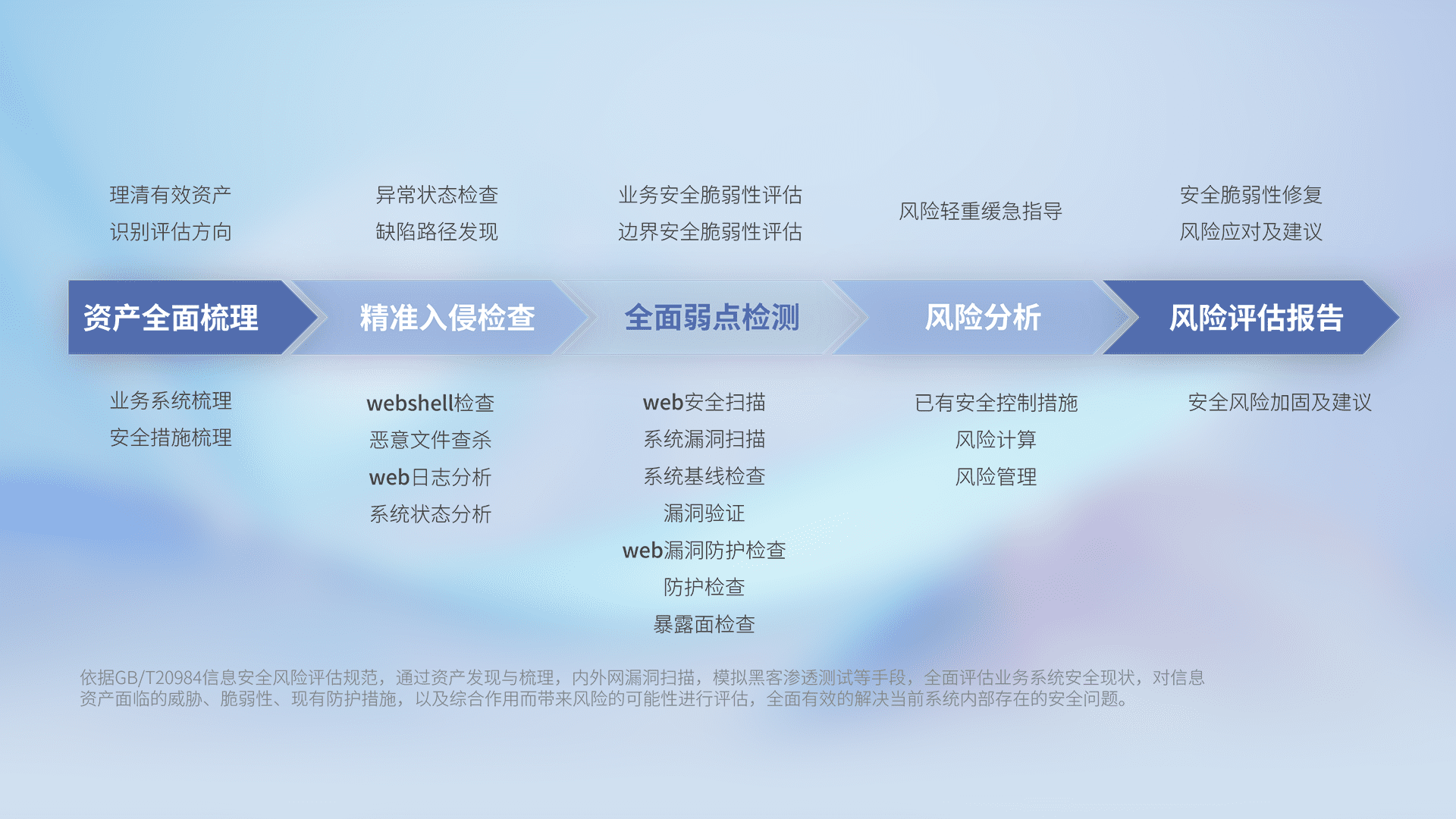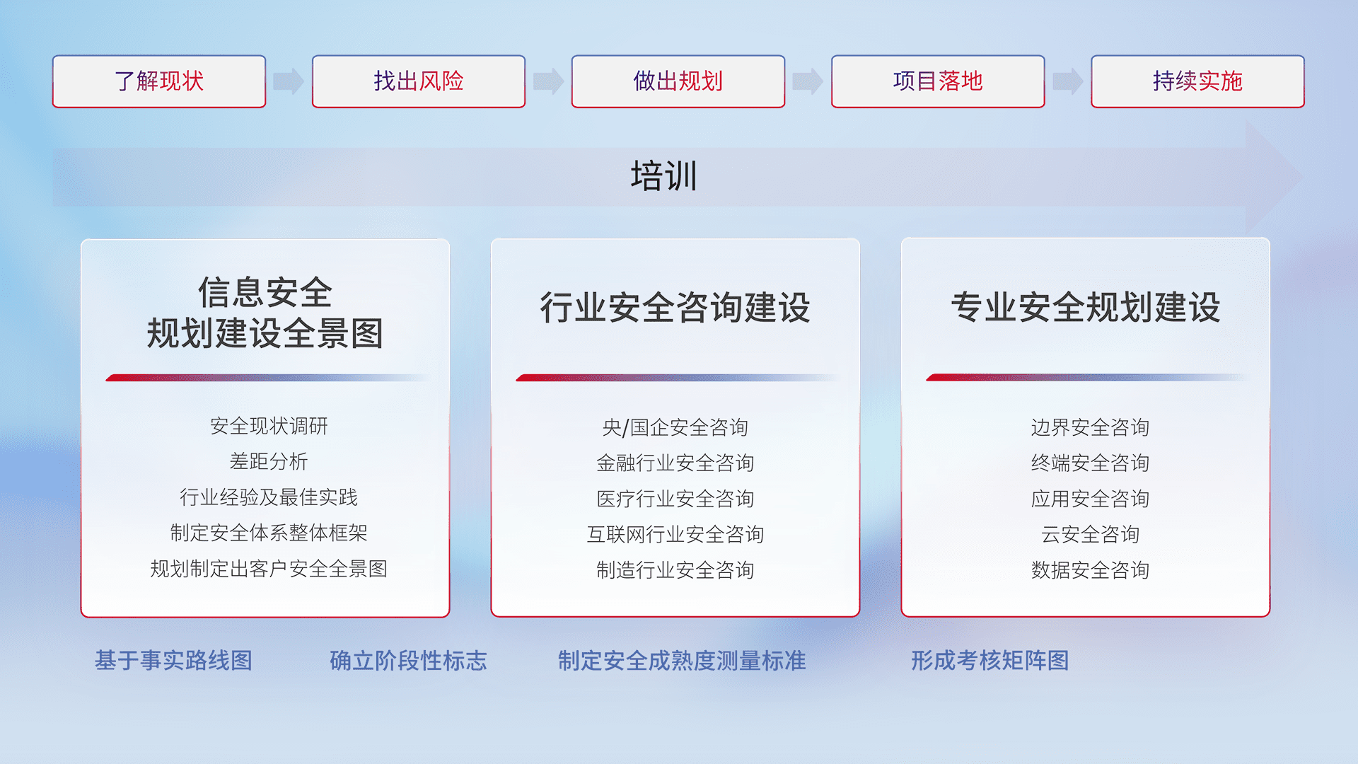 针对客户行业特性,,以专业的安全服务+多厂商联合解决方案提供专属的一站式安全管理服务,,,帮助客户全面感知网络空间威胁,,基于识别、、检测、、、分析、、、、防护、、监测、、、、响应的服务理论模型,,,从方案咨询、、集成交付、、评估验证、、、优化加固、、、、运维运营,,,,致力于为客户提供完整的闭环管理式安全服务。。以实战经验为客户打造高抵御风险的安全体系,,,,帮助客户发现威胁、、对抗威胁、、、处置威胁,,,,不断积累安全对抗能力,,持续保障数字化安全。。